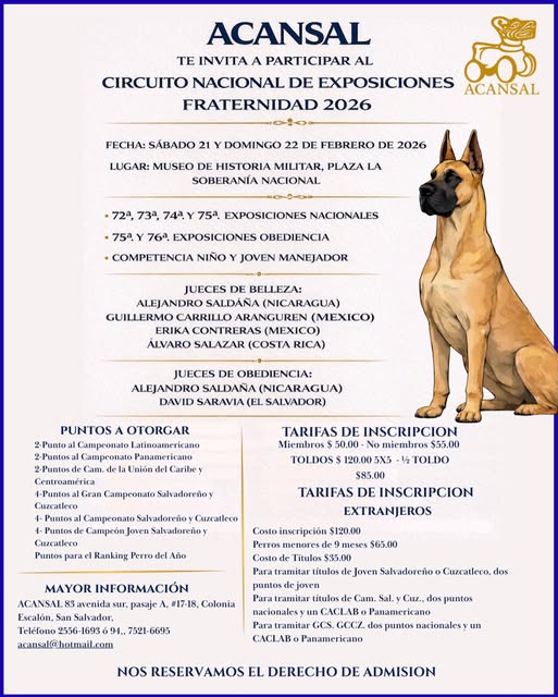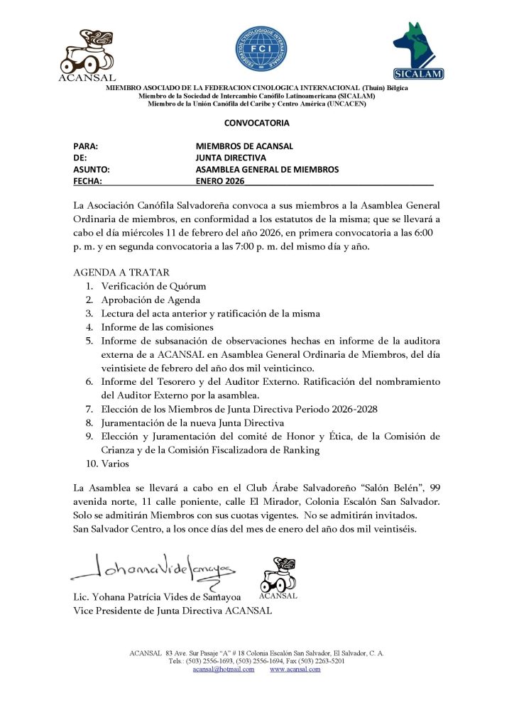 Por medio de la presente nos permitimos informarle, que en la Asamblea General de Miembros de la Asociación Canófila Salvadoreña, realizada el martes 27 de febrero del presente año, en la ciudad de San Salvador, se eligió la nueva junta directiva de ACANSAL, que fungirá durante el período de dos años, que vence en febrero del 2026.